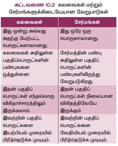 அட்டவணை 10.2 கலவைகள் மற்றும் சேர்மங்களுக்கிடையேயான வேறுபாடுகள்