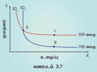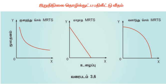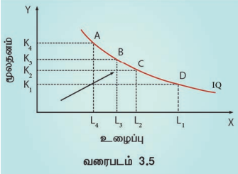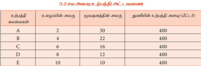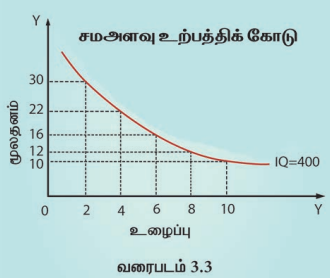 மேற்காணும் அட்டவணை 3.2-ன்படி உழைப்பு மற்றும் மூலதனத்தின் ஐந்து இணைப்பு கலவை ஒரே அளவிலான உற்பத்தியை தருகிறது. அதாவது 400 மீட்டர் துணி.