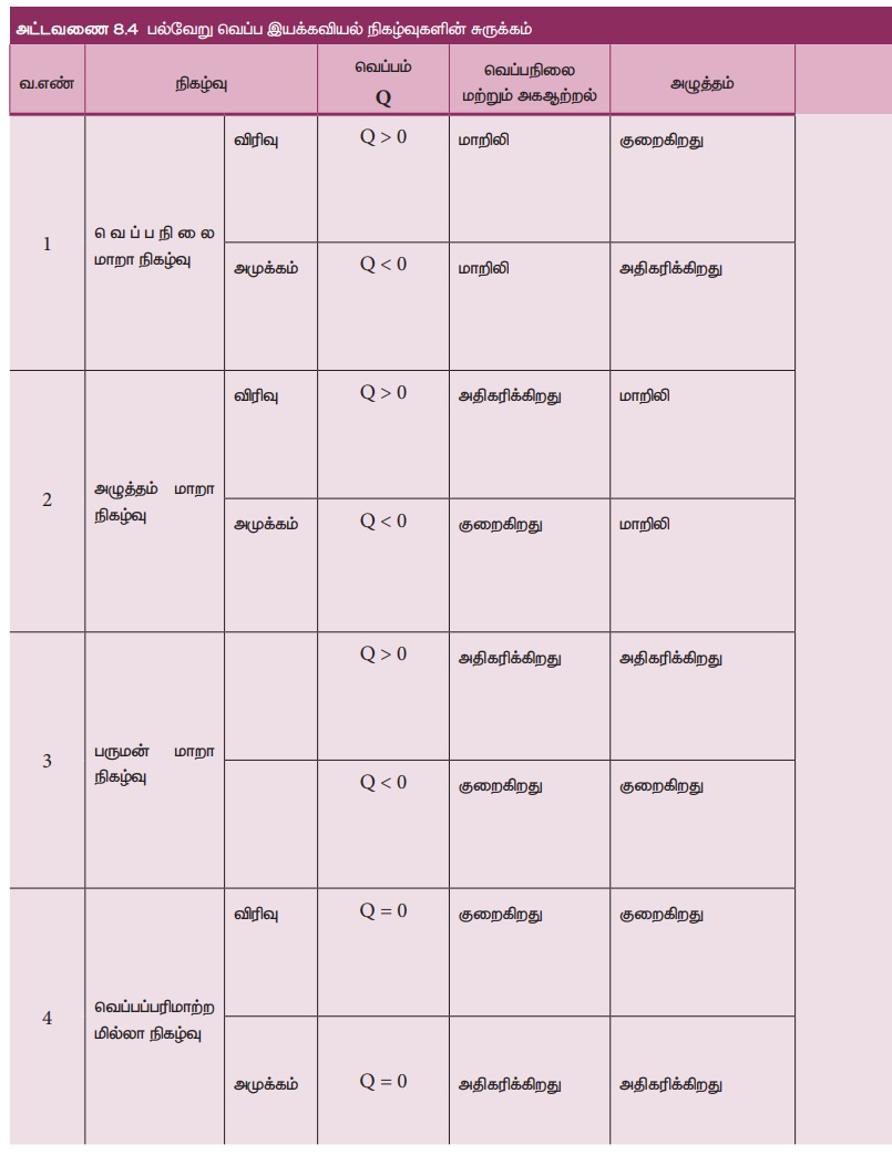 பல்வேறு வெப்ப இயக்கவியல் நிகழ்வுகளின் சுருக்கம் அட்டவணை (8.4) இல் கொடுக்கப்பட்டுள்ளன.