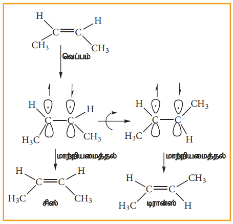 ஏதேனும் ஒரு மாற்றியத்தினை அதிக வெப்பநிலைக்கு சூடுபடுத்துதல் அல்லது ஒளியை உட்கவரச் செய்வதன் மூலம் சிஸ் மாற்றியத்தினை, டிரான்ஸ் மாற்றியமாகவோ அல்லது டிரான்ஸ் மாற்றியத்தினை சிஸ் மாற்றியமாகவோ மாற்ற இயலும். வெப்பமானது, π பிணைப்பு பிளவுறத் தேவையான ஆற்றலைத் தருவதால் (62 Kcal mol-1 அளவிலான ஆற்றல்) அப்பிணைப்பு பிளக்கப்படுகிறது. இதன் காரணமாக சிக்மா பிணைப்பைச் சுற்றி சுழற்சி ஏற்படுவதற்கு வாய்ப்பு ஏற்படுகிறது. மேலும் குளிர்விக்கும் போது π பிணைப்பு இரு வழிகளில் உருவாக வாய்ப்புள்ளதால், சிஸ் மற்றும் டிரான்ஸ் 2-பியூட்டீன் ஆகியவற்றின் கலவை உருவாகின்றது.