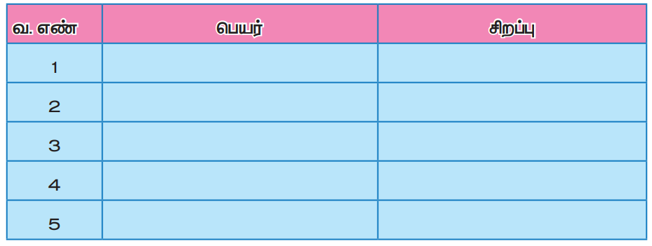 • நூலகத்திற்குச் சென்று வரலாற்று நூல்களைப் படித்து யாரேனும் ஐந்து அரசர்களின் பெயர்களையும், அவர்கள் செய்த நற்செயல்களையும் தெரிந்து கொண்டு அட்டவணையை நிரப்பி வருக