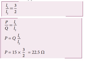 ஒரு மீட்டர் சமனச்சுற்று ஆய்வில் 15 Ω என்ற படித்தர மின்தடையாக்கி வலது இடைவெளியில் இணைக்கப்பட்டுள்ளது. சமன்செய் நீளங்களின் விகிதம் 3:2 எனில் மற்றொரு இடைவெளியில் உள்ள மின்தடையாக்கியின் மதிப்பைக் காண்க.