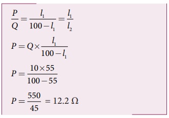 ஒரு மீட்டர் சமனச் சுற்றில், மின்தடைப் பெட்டியில் 10 Ω என்ற அளவு மின்தடை வைக்கப்பட்டுள்ளது. சமன்செய் நீளத்தின் மதிப்பு l1 = 55 cm எனில் தெரியாத மின்தடையின் மதிப்பை கணக்கிடுக.