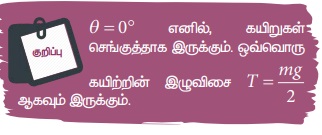 (ii) இரண்டு கயிறுகளின் வழியே செயல்படும் இழுவிசைகள் (T)