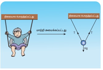ஊஞ்சலில் அமர்ந்திருக்கும் குழந்தையை, நிறை ஒன்று நீட்சித்தன்மையற்ற மெல்லிய இரண்டு கயிறுகளால் கட்டித் தொங்கவிடப்பட்ட அமைப்பாகக் கருதலாம். குழந்தையின் மீது இரண்டு விசைகள் செயல்படுகின்றன. அவை