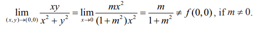 -ன் மதிப்பு இல்லை. அதனால் (0,0) இல் f தொடர்ச்சியானது அல்ல.