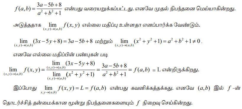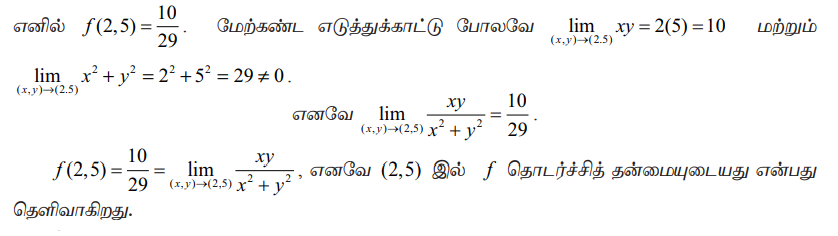 f(x,y) = , (xy) / (x2 + y2), (x,y) ≠ (0,0) மற்றும் f (0,0) = 0 என்ற சார்பை எடுத்துக் கொள்வோம். இந்தச் சார்பு f , (0,0)-ஐத் தவிர ℝ2 -ன் மற்ற எல்லா புள்ளிகளிலும் தொடர்ச்சித்தன்மையுடையது என நிறுவுக.