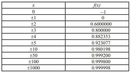அட்டவணையிலிருந்து x தேவையான அளவிற்கு பெரியதாகும்போது f(x)−ன் மதிப்பு 2−ஐ நெருங்கி நெருங்கி செல்வதைக் காணலாம்.