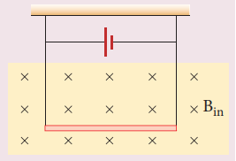 2. நீள் அடர்த்தி 0.2 g m−1 கொண்ட கடத்தி ஒன்று படத்தில் காட்டியுள்ளவாறு இரண்டு நெகிழ்ச்சித்தன்மை கொண்ட கம்பிகளினால் தொங்கவிடப்பட்டுள்ளது. தாளுக்கு உள்ளே செல்லும் திசையில் 1T வலிமை கொண்ட காந்தப்புலத்திற்குள் இவ்வமைப்பு வைக்கப்படும்போது, கடத்தி தொங்க விடப்பட்டுள்ள கம்பிகளின் இழுவிசை சுழியாகிறது எனில், கடத்தியின் வழியே பாயும் மின்னோட்டம் மற்றும் மின்னோட்டம் பாயும் திசை ஆகிவற்றைக் காண்க. g = 10 m s−2 எனக் கருதுக.