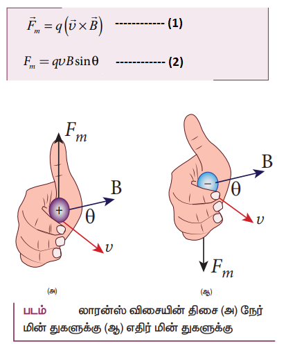தத்துவம்: மின்துகள், காந்தப்புலத்திற்கு செங்குத்தாக செல்லும் போது, அது லாரன்ஸ் விசையை உணரும்.