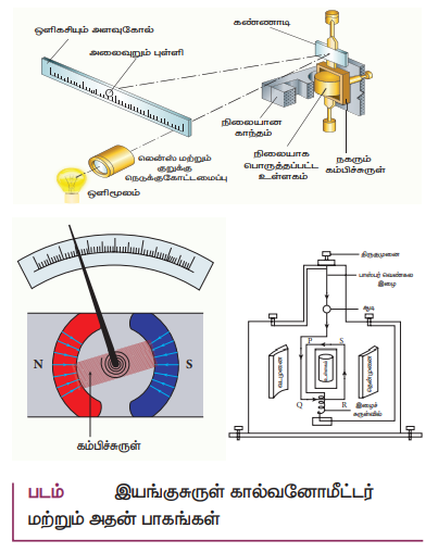 17. இயங்கு சுருள் கால்வனோ மீட்டர் ஒன்றின் தத்துவம் மற்றும் இயங்கும் முறையை விளக்கவும்.