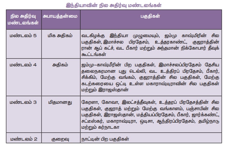 இதனடிப்படையில் இந்திய தரநிர்ணய நிறுவனம் இந்தியாவை 5 நில அதிர்வு மண்டலங்களாக வகைப்படுத்தியுள்ளது.