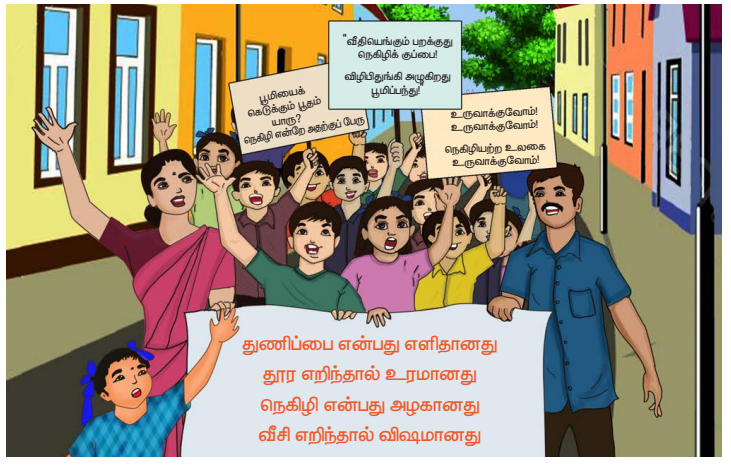 வேதனையுடன் பள்ளிக்குச் சென்றனர் மேரியும் மகிழினியும். சோகமாக அமர்ந்திருந்த இருவரையும் அழைத்துக் காரணம் கேட்டார் வகுப்பு ஆசிரியர். பிறகு, "நெகிழிகளைப் பயன்படுத்துவதால் பல தீமைகள் ஏற்படுகின்றன. மட்காத இந்தக் குப்பைகளால் சாக்கடைகளில் நீர்தேங்கி துர்நாற்றம் வீசுவதோடு, ஈ மற்றும் கொசுக்கள் உற்பத்தியாகி நோய் பரவுகிறது. நெகிழிக் குப்பைகளை எரிப்பதால் ஓசோன் படலம் பாதிப்படைகிறது. இதனால் சூரியனின் புற ஊதாக் கதிர்கள் நேரடியாக நம்மைத் தாக்குகிறது. இதனால் தோல் நோய்கள் ஏற்படுகின்றன", என்று விளக்கினார். இதுபற்றிப் பேசிக்கொண்டிருப்பதை விட்டு விட்டுச் செயலில் இறங்குவோம் என்றார். பள்ளியின் நலன் காக்கும் பள்ளி மேலாண்மைக் குழுவினைக் கூட்டி, நெகிழி பற்றிய தீமைகளை எடுத்துரைத்தார்.