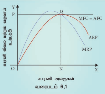 வரைபடம் 6.1ல் நிறைவுப் போட்டியில் காரணிகளின் விலை எவ்வாறு காரணி அங்காடியில் தீர்மானிக்கப்படுகிறது என்பது விளக்கப்படுகிறது. X அச்சில் காரணியின் அலகுகளும் Y அச்சில் காரணியின் விலை மற்றும் வருவாய் உற்பத்தியும் குறிப்பிடப்படுகின்றன.