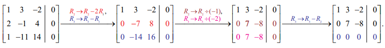 x + 3y − 2z = 0, 2x – y + 4z = 0, x −11y + 14z = 0 என்ற சமன்பாட்டுத் தொகுப்பைத் தீர்க்கவும்.