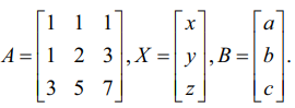 தொகுப்பின் அணி வடிவம் AX = B, இங்கு