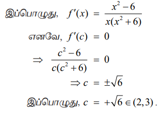 f(x) = log (x2 + 6 / 5x)என்ற சார்பிற்கு [2,3] என்ற இடைவெளியில் ரோலின் தேற்றத்தைநிறைவு செய்யும் 'c' -ன் மதிப்பைக் கணக்கிடுக.