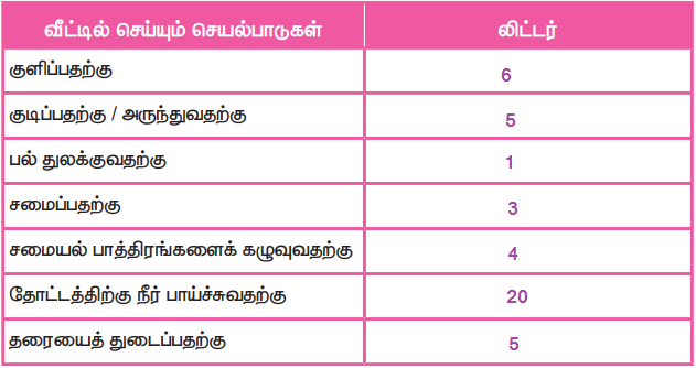 5. பின்வரும் செயல்பாடுகளுக்கு உங்கள் வீட்டில் எத்தனை லிட்டர் தண்ணீரைப் பயன்படுத்துவீர்கள்? அட்டவணையை நிறைவு செய்க