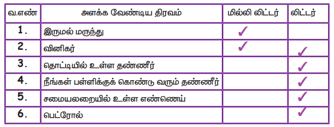 2. கொடுக்கப்பட்ட திரவங்களை அளப்பதற்குப் பயன்படும் சரியான அலகுகளை ‘✓’ குறியிடுக.