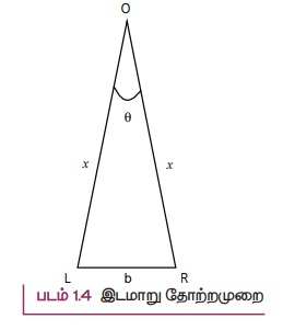 படம் 1.4 இல் காட்டியுள்ளவாறு, O என்ற புள்ளியிலுள்ள ஏதேனும் ஒரு பொருளைக் கருதுக. அப்பொருளை உற்று நோக்குபவரின் இடது மற்றும் வலது கண்களின் நிலையை முறையே L மற்றும் R என்க. O புள்ளியிலுள்ள பொருளை தனது வலது கண்ணை மூடிய நிலையில் இடது கண்ணால் மட்டும் பார்க்கும் நிலையில் அவரின் இடது கண்ணையும், பொருளையும் இணைத்தும் நேர்க்கோடு LO என்க. இதேபோன்று இடது கண்ணை மூடிக்கொண்டு வலது கண்ணால் பொருளை பார்க்கும் போது, வலது கண்ணையும் பொருளையும் இணைக்கும் நேர்க்கோடு RO என்க. இவ்விரண்டு நேர்க்கோடுகளும் O புள்ளியோடு ஏற்படுத்தும் கோணம் θ விற்கு, இடமாறு தோற்றக்கோணம் என்று பெயர்.