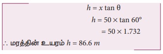 தரையில் ஒரு புள்ளியிலிருந்து ஓர் மரத்தின் உச்சியானது60 ஏற்றக் கோணத்தில் தோன்றுகிறது. மரத்திற்கும் அப்புள்ளிக்கும் இடைப்பட்ட தூரம் 50m எனில் மரத்தின் உயரத்தைக் காண்க.