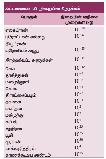 வேறுபட்ட பொருட்களின் நிறைகளின் வகைகள் அட்டவணை 1.6.இல் காட்டப்பட்டுள்ளது.