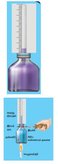 வெப்பத்தை அளிப்பதை நிறுத்திவிடவும். நீர் குளிர்ச்சி அடைந்தவுடன் குழாய்யில் உள்ள நீர் மட்டத்தினை கவனிக்கவும். நிகழ்ந்த மாற்றம் யாது ? ஏன்?