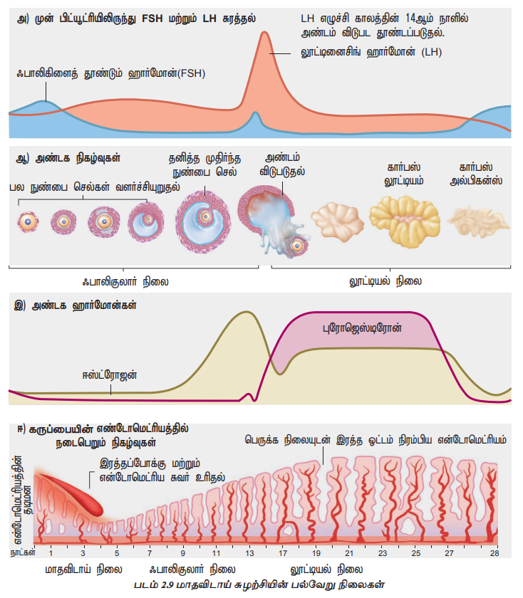 மாதவிடாய் சுழற்சி கீழ்காணும் நிலைகளைக் கொண்டது (படம் 2.9).