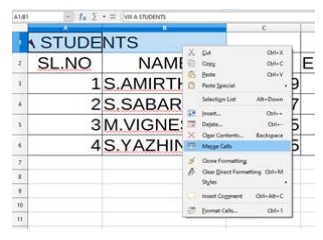 Format Bar ல் உள்ள Merge Cells என்பதை கிளிக் செய்க அல்லது தேவையான அறைகளைத் தேர்வு