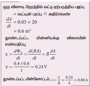 சீரான காந்தப்புலம் 0.4 T இல் 0.03 m? பரப்பு கொண்ட வட்ட உலோக வட்டு ஒன்று சுழலுகிறது. சுழற்சி அச்சானது வட்டின் மையம் வழியாகவும் அதன் தளத்திற்கு செங்குத்தாகவும் அமைந்துள்ளது. மேலும் சுழற்சி அச்சானது காந்தப்புலத்தின் திசைக்கு இணையாக உள்ளது. வட்டு ஒரு விநாடி நேரத்தில் 20 சுழற்சிகளை நிறைவு செய்கிறது. வட்டின் மின்தடை 40 எனில், அதன் அச்சுக்கும் விளிம்புக்கும் இடையே தூண்டப்படும் மின்னியக்குவிசை மற்றும் வட்டில் பாயும் தூண்டப்பட்ட மின்னோட்டம் ஆகியவற்றைக் கணக்கிடுக.