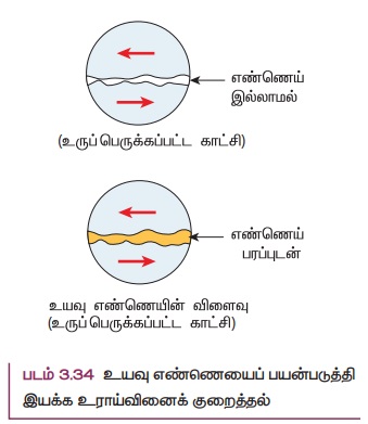 தொழிற்சாலைகளில் உள்ள கனரக இயந்திரங்களின் பரப்புகள் ஒன்றுடன் ஒன்று சார்பியக்கத்தில் உள்ள போது உராய்வு ஏற்பட்டு வெப்ப வடிவில் ஆற்றல் இழக்கப்படுகிறது. இதனால் கனரக இயந்திரங்களின் செயல் திறன் குறைந்து விடுகிறது. இவ்வாறு ஏற்படும் இயக்க உராய்வினை குறைப்பதற்காக உயவு எண்ணெய்கள் (lubricants) எவ்வாறு பயன்படுகின்றன என்பதை படம் 3.34 விளக்குகிறது.