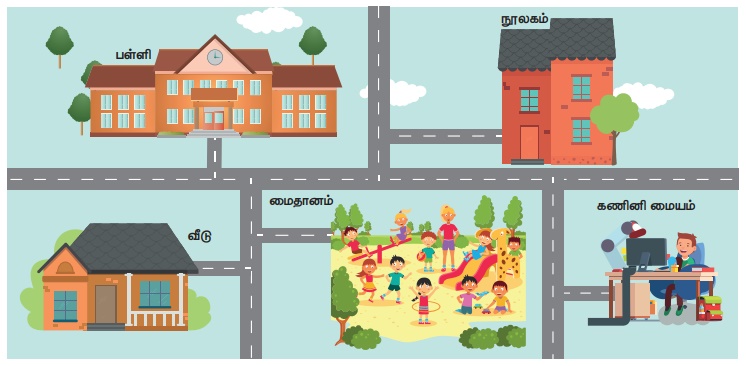 பள்ளிக்கூடம் → நூலகம் → கணினி மையம் → வீடு