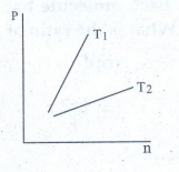 15. T1 மற்றும் T2 என்ற இருவேறு வெப்பநிலைகளில் உள்ள நல்லியல்பு வாயு ஒன்றின் அழுத்தத்துடன் எண் அடர்த்தியின் தொடர்பு பின்வரும் வரைபடத்தில் காட்டப் பட்டுள்ளது. இவ்வரைபடத்திலிருந்து நாம் அறிவது
