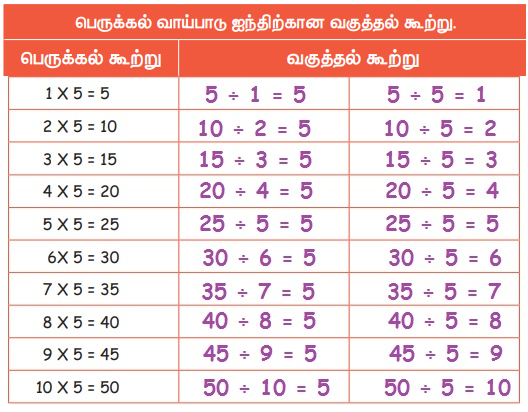 பெருக்கல் வாய்பாடு ஐந்திற்கான வகுத்தல் கூற்றை எழுதுக.