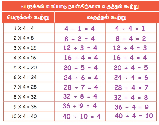 பெருக்கல் வாய்பாடு நான்கிற்கான வகுத்தல் கூற்றை எழுதுக.