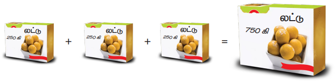 சுனிதா, தன்னுடைய 3 நண்பர்களுக்குத் தனித்தனியே pppppp1/4 கி.கி இனிப்புகள் வழங்க விரும்பினார். எனவே, அவர் இனிப்பகம் சென்று, விற்பனையாளரிடம் ppppppp1/4 கி.கி எடையுடைய மூன்று இனிப்புப் பொட்டலங்கள் வழங்குமாறு கேட்டார். அவர் வாங்கிய இனிப்பின் அளவு எவ்வளவு?