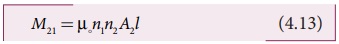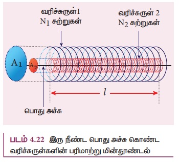 சமநீளம் l கொண்ட இரண்டு பொது - அச்சு வரிச்சுருள்களைக் கருதுக. வரிச்சுருள்களின் ஆரங்களுடன் ஒப்பிடும் போது அவற்றின் நீளம் அதிகமாதலால், வரிச்சுருள்களுக்கு உட்புறம் உருவாகும் காந்தப்புலம் சீரானதாக அமையும். மேலும் முனைகளில் ஏற்படும் சீரற்ற காந்தப்புல விளைவு (fringing effect) புறக்கணிக்கத்தக்கது எனக்கொள்வோம். படம் 4.22 இல் காட்டியுள்ளவாறு A1 மற்றும் A2 என்பன வரிச்சுருள்களின் குறுக்கு வெட்டுப்பரப்புகள் என்க. A2 -ஐ விட A1 பெரியது என்போம். இவற்றின் சுற்று அடர்த்திகள் முறையோ n1 மற்றும் n2 ஆகும்.