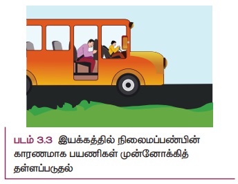 ஓய்வு நிலையிலுள்ள பேருந்து ஒன்று இயங்கத்தொடங்கும் போது அப்பேருந்தில் உள்ள பயணிகள் நிலைமத்தின் காரணமாக திடீரென்று பின்னோக்கித் தள்ளப்படுகின்றனர். ஏனெனில் பயணியின் உடல் நிலைமப்பண்பின் காரணமாக தொடர்ந்து ஓய்வுநிலையிலேயே இருக்க முயல்கிறது. ஆனால் பேருந்து இயங்கத் தொடங்குகிறது. இதன் காரணமாகவே பயணிகளின் உடல் பின்னோக்கித் தள்ளப்படுவதாகத் தோன்றுகிறது. (படம் 3.2)