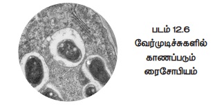 லெகூம் தாவரங்களின் வேர் முடிச்சுகளில் வாழும் ரைசோபியம் பாக்டீரியம் வளிமண்டல நைட்ரஜனை நிலைநிறுத்த உதவுகிறது. இந்த வகையான கூட்டுயிர் வாழ்க்கையில் பாக்டீரியம் மற்றும் தாவரம் இரண்டுமே பயனடைகின்றன. வேர்முடிச்சுகள் ரைசோபிய பாக்டீரிய தொற்றின் மூலம் ஏற்படுகிறது. ரைசோபியம் ஒம்புயிர் செல்லினுள் நுழைந்து பெருக்கம் அடைகிறது. அவை, ஓம்பியிர் சைட்டோபிளாசத்துடன் சேராமல், உறையால் சூழப்பட்ட தனி அமைப்புகளில் காணப்படுகின்றன. (படம் 12.6)