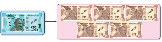50 ரூபாயானது ஐந்து 10 ரூபாய்க்குச் சமம்.