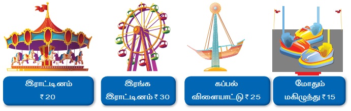ஆகிய மூவரும் ஒருமுறை இராட்டினம் விளையாடினர் எனில், அவர்கள் செலுத்த வேண்டிய மொத்தப் பணம் எவ்வளவு?