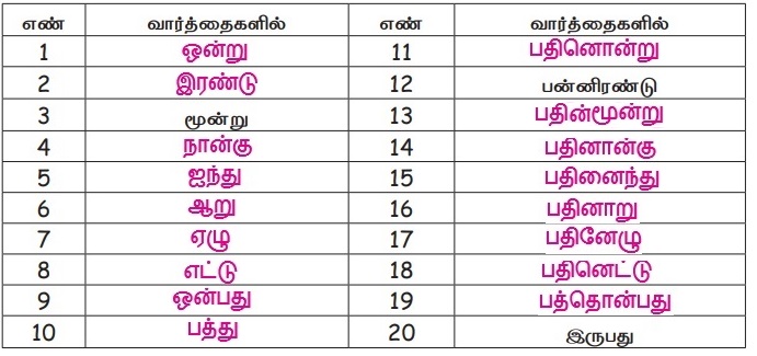 பொருத்தமான எண் பெயரை எழுதி அட்டவணையை நிறைவு செய்க.