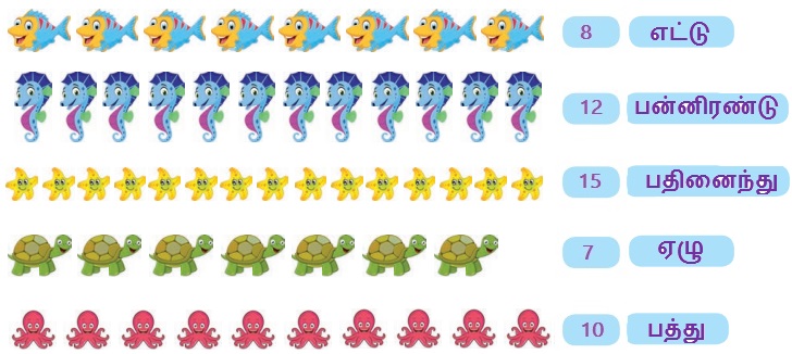1. கொடுக்கப்பட்டுள்ள கடல்வாழ் உயிரிகளை எண்ணி, எண்ணிக்கையையும்,
