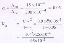 8. 298K வெப்பநிலையில் 0.01M செறிவு கொண்ட 1:1 வலிமை குறைந்த மின்பகுளி கரைசலின் கடத்துத்திறன் மதிப்பு 1.5 × 10-4 Scm-1 எனில்,