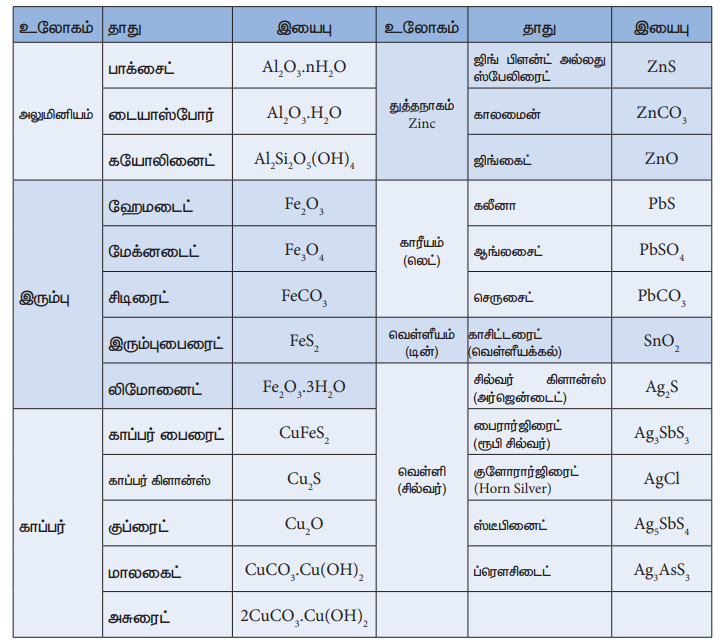 அட்டவணை 1.1 சில உலோகங்கள் மற்றும் அவைகளின் பொதுவான தாதுக்கள்