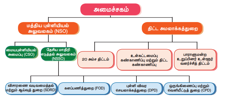 இதில் புள்ளியியல் பிரிவானது தேசிய புள்ளியியல் அலுவலகம் (National Statistical Office, NSO) என அழைக்கப்படுகிறது. இதில் மேலும் சில பிரிவுகளாக மத்திய புள்ளியியல் கழகம் (Central Statistical Organization, CSO), கனிணி மையம், மற்றும் தேசிய மாதிரிக் கூறெடுப்பு விசாரணை அலுவலகம் (National Sample Survey Office, NSSO) உள்ளன.