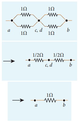 a மற்றும் b புள்ளிகளுக்கிடையே தொகுப்பயன் மின்தடையைக் காண, மின்னோட்டமானது a சந்தி வழியாக மின்சுற்றில் நுழைவதாக கொள்வோம். அமைப்பில் வெளிப்புற மின்தடைகள் அனைத்தும் சமமாக 1Ω அளவில் இருப்பதால் ac மற்றும் ad பிரிவுகளில் சம அளவு மின்னோட்டம் பாயும். இதனால் c மற்றும் d புள்ளிகள் சம மின்னழுத்தத்தில் அமைவதால் 5 Ω மின்தடையாக்கி வழியே எவ்வித மின்னோட்டமும் பாயாது. எனவே தொகுபயன் மின்தடையைக் காண 5Ω மின்தடையானது எவ்வித பங்கையும் செலுத்தாது. எனவே 5 Ω மின்தடையை நாம் புறக்கணித்து மின்சுற்றை பின்வருமாறு எளிமைப்படுத்தி வரையலாம்.