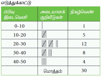 குழுவில் நிகழ்வெண்களை கணக்கிடுவதற்கு அடையாளக் குறியீடுகளை பயன்படுத்துகிறார்கள். அப்பிரிவிற்கு எதிரே செங்குத்து கோடாக அடையாள குறியீட்டை (1) இடுக. நான்கு கோடுகளுக்கு மேற்பட்டால், நான்கு கோடுகளின் மீது ஒரு குறுக்குக்கோடு இடுதல் வேண்டும். இவை நிகழ்வெண்களை எளிதாக கணக்கிடுவதற்கு உதவுகிறது.