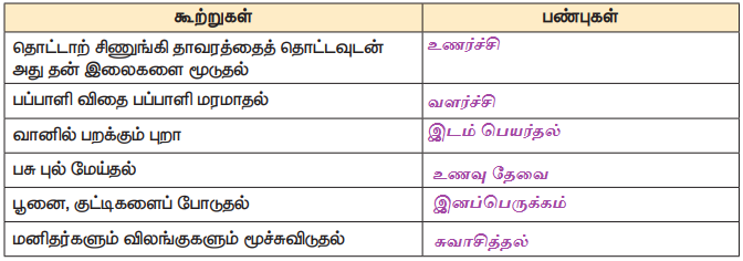 கீழே கொடுக்கப்பட்டுள்ள கூற்றுகள் உயிருள்ளவற்றின் பண்புகளை விளக்குகின்றன. பின்வரும் குறிப்புகளைப் பயன்படுத்தி, அப்பண்புகளை அடையாளம் கண்டறிந்து எழுதுக.