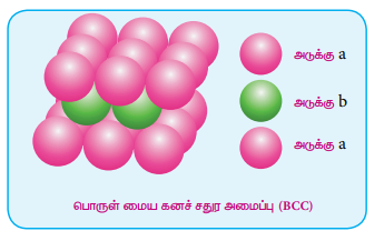 bcc வடிவமைப்பில் ஒரு அலகுக்கூட்டில் காணப்படும் கோளங்களின் எண்ணிக்கை இரண்டு என நாம் அறிவோம். எனவே அனைத்துக் கோளங்களின் கனஅளவு